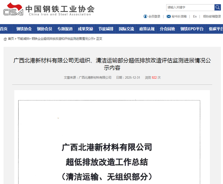 近日,廣西北港新材料有限公司(以下簡(jiǎn)稱“北港新材料”)的超低排放工作總結(jié)(清潔運(yùn)輸與無組織排放部分)在中國(guó)鋼鐵工業(yè)協(xié)會(huì)官方網(wǎng)站正式公示。該項(xiàng)目由九九智能環(huán)保于2025年4月承建,并于同年7月全面建成,目前相關(guān)設(shè)施運(yùn)行穩(wěn)定,標(biāo)志著北港新材料在綠色低碳轉(zhuǎn)型道路上邁出了堅(jiān)實(shí)一步。