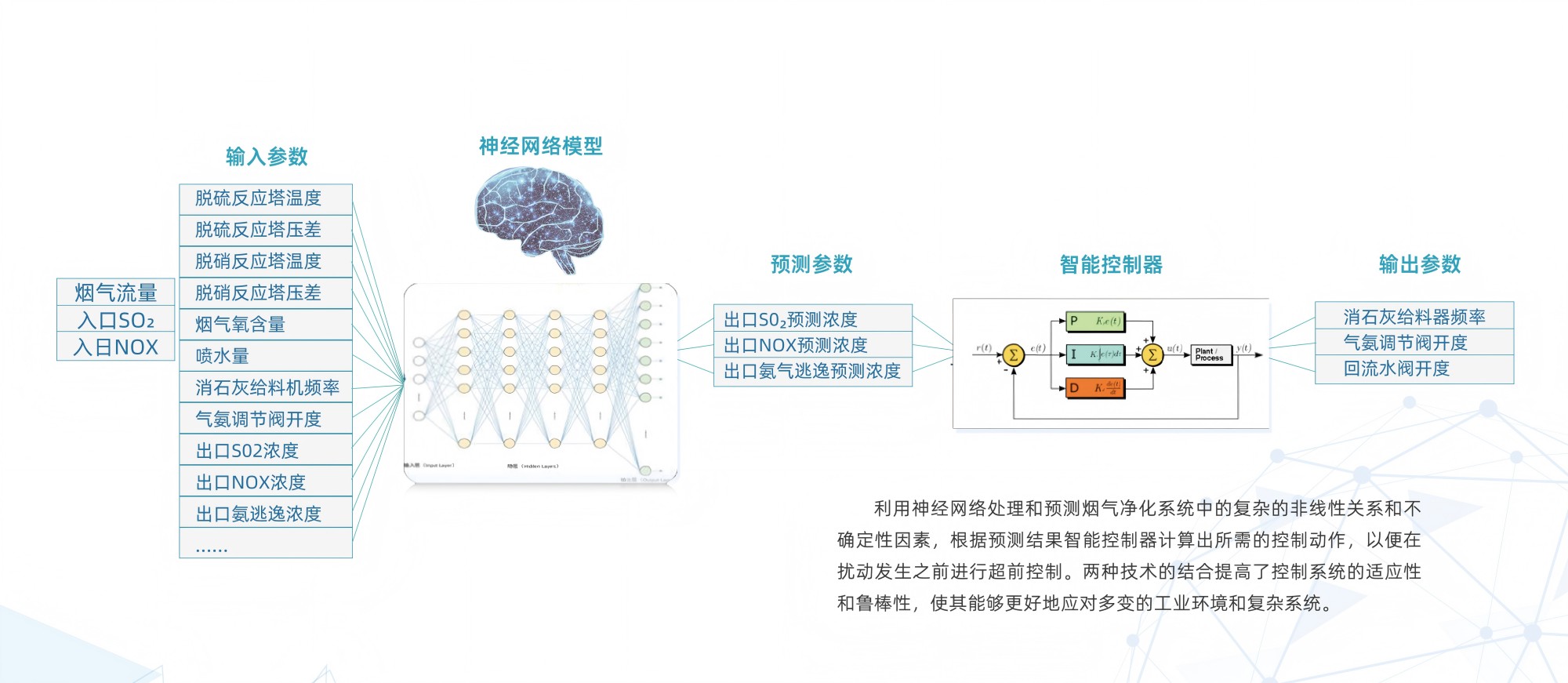 在利用神經(jīng)網(wǎng)絡(luò)處理和預(yù)測(cè)煙氣凈化系統(tǒng)中的復(fù)雜的非線性關(guān)系和不確定性因素,根據(jù)預(yù)測(cè)結(jié)果智能控制器計(jì)算出所需的控制動(dòng)作,以便在擾動(dòng)發(fā)生之前進(jìn)行超前控制。兩種技術(shù)的結(jié)合提高了控制系統(tǒng)的適應(yīng)性和魯棒性,使其能夠更好地應(yīng)對(duì)多變的工業(yè)環(huán)境和復(fù)雜系統(tǒng)。
